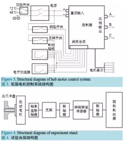 2.1. 輪轂電機控制系統 輪轂電機控制系統主要用于獨立控制電機的啟動、加速、正反轉、電制動等,如圖 3 所示。系統鉛酸動力電池串聯作為電源,雙投開關用于切換系統輸入電壓等級,方便不同額定電壓的控制 器的快速更換。反轉開關閉合,電機反向運行,反之正轉。電子加速器和制動踏板分別控制電機的速度 和電制動。